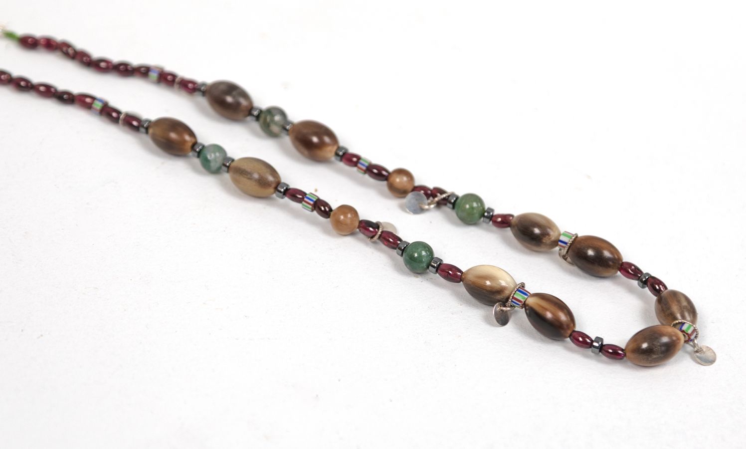 vintage hand crafted Scottish stag horn. African trade beads, stirling silver, garnet. moss agate and hematite.