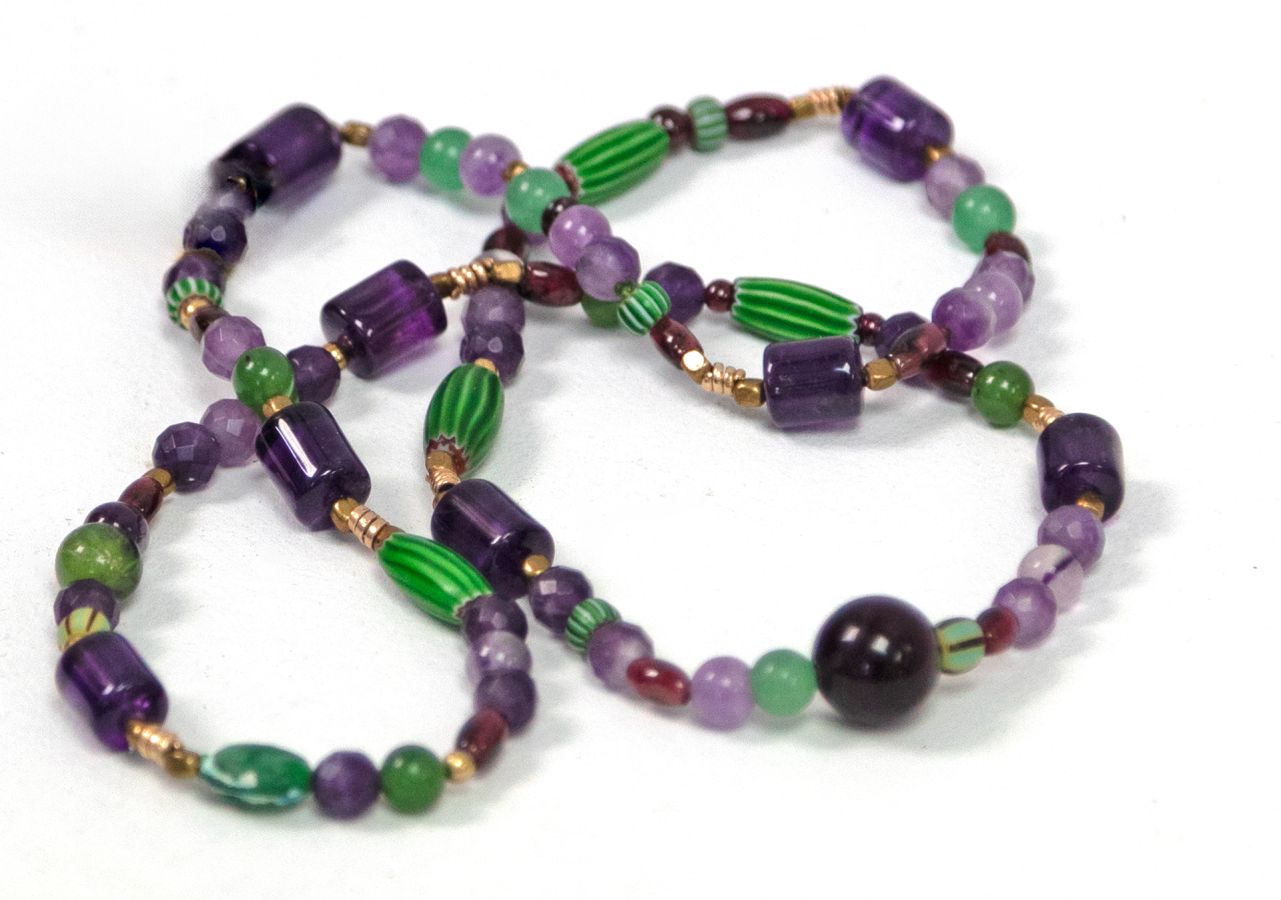 african trade beads, vintage amethyst & garnet. roman period brass & singular glass bead, gold-filled spirals. moss agate & jadeite.