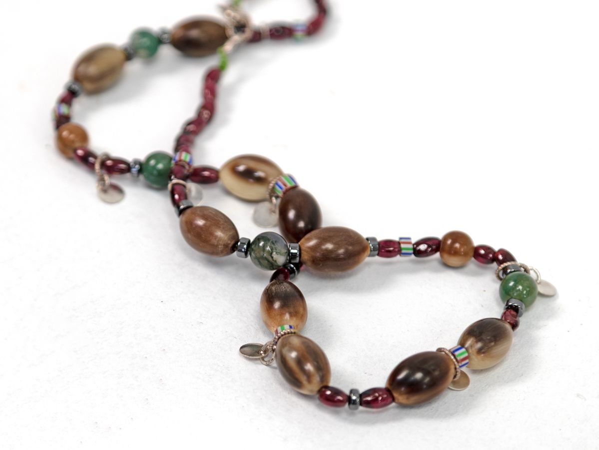 vintage hand crafted Scottish stag horn. African trade beads, stirling silver, garnet. moss agate and hematite.
