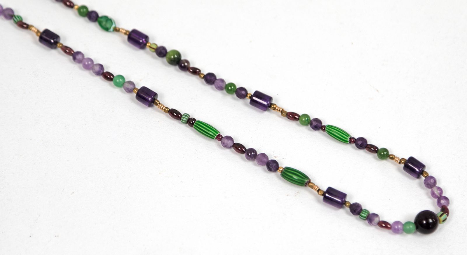 african trade beads, vintage amethyst & garnet. roman period brass & singular glass bead, gold-filled spirals. moss agate & jadeite.